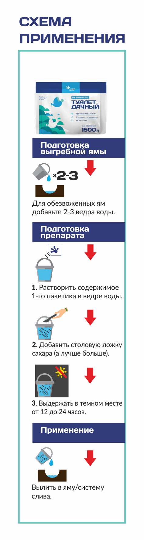 Содержимое одного пакета высыпать в ведро с водой , перемешать. Для усиленного эффекта добавить столовую ложку сахара и выдержать 12 часов. Далее залить в выгребную яму/систему слива туалета. Если содержание ямы обезвожено, предварительно добавить 2-3 ведра воды. Эффективность препарата выше во влажной среде. Повторить обработку через 30 дней либо по необходимости.